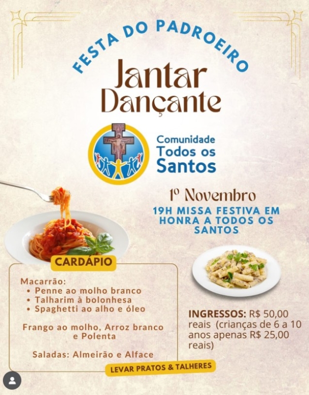 A Comunidade Todos os Santos convida você e sua família para celebrar juntos a Missa Festiva em honra a Todos os Santos, seguida de um delicioso Jantar Dançante!