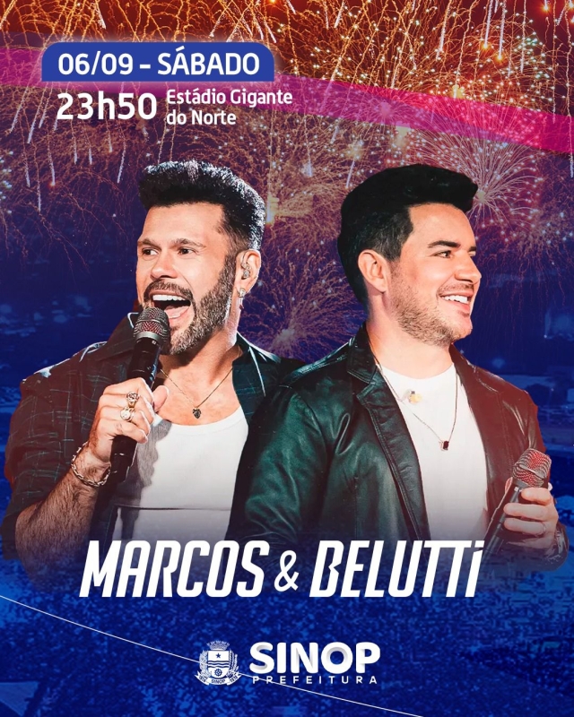A dupla Marcos e Belutti vai emocionar Sinop com um show cheio de sucessos que marcaram gerações! Uma noite inesquecível de música sertaneja e muita emoção.